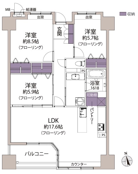 ・専有面積90.59平米の3LDK、南向きのお部屋です |